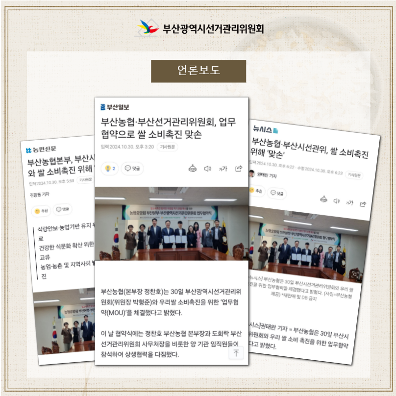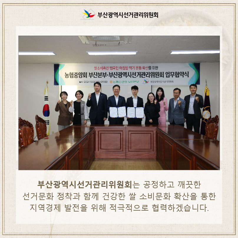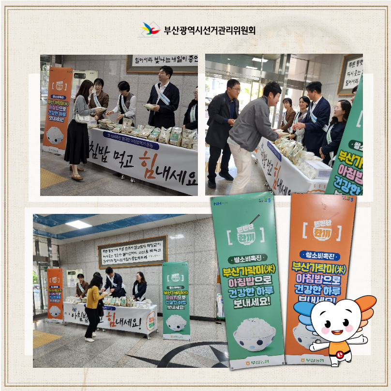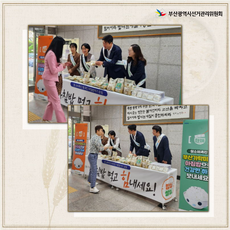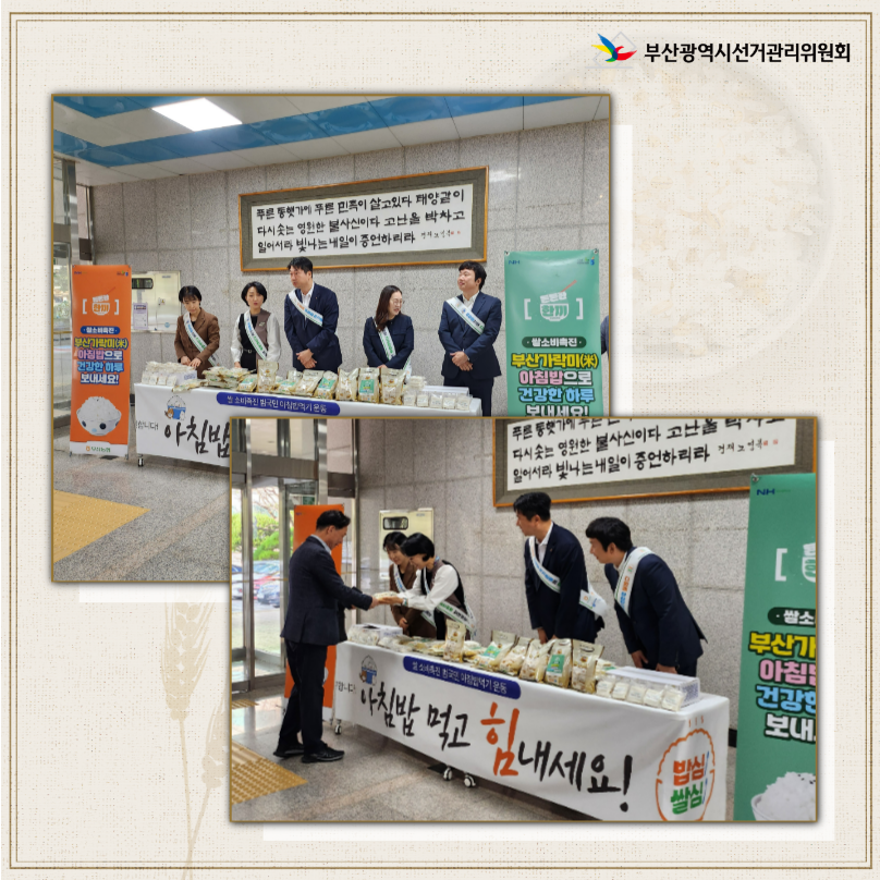 부산시선관위는 공정하고 깨끗한 선거문화 정착과 함께 건강한 쌀 소비문화 확산을 통한 지역경제 발전을 위해 적극적으로 협력하겠습니다.