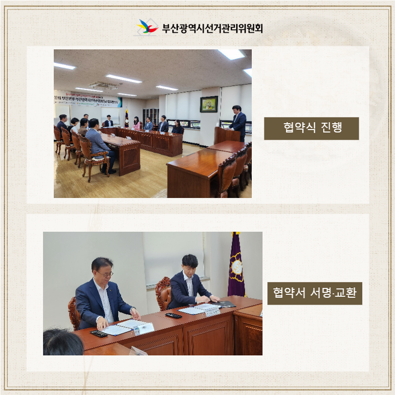 사진설명) 부산광역시선거관리위원회와 농엽중앙회 본부가 업무협약(MOU) 협약식을 진행하였고 협약서 서명·교환을 하였습니다.