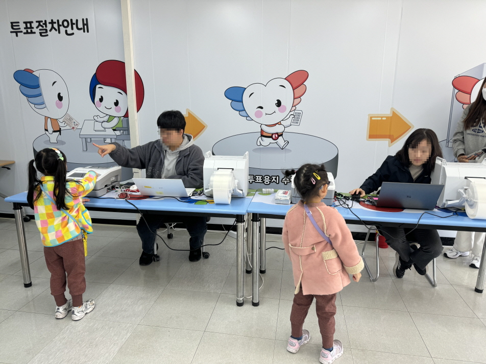 * 사진설명 : 선거체험관 체험존에서 원아 2명이 투표용지를 발급받기 위하여 대기하고 있다.