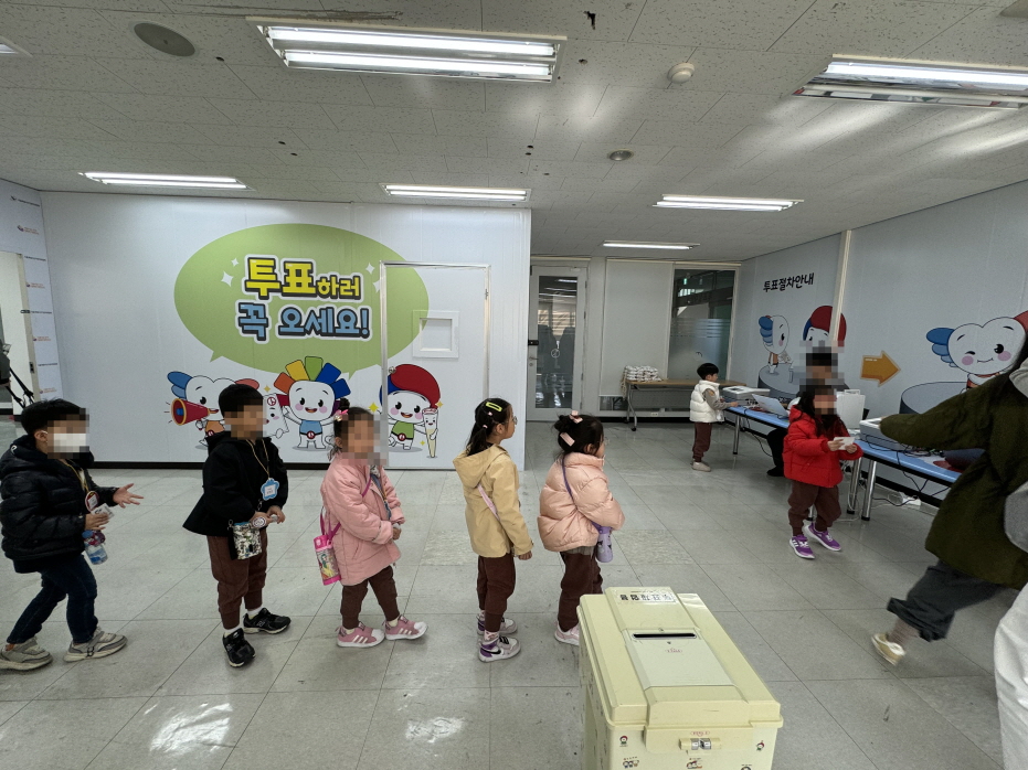 * 사진설명 : 선거체험관 체험존에서 원아 5명이 투표용지를 발급받기 위하여 대기하고 있다.