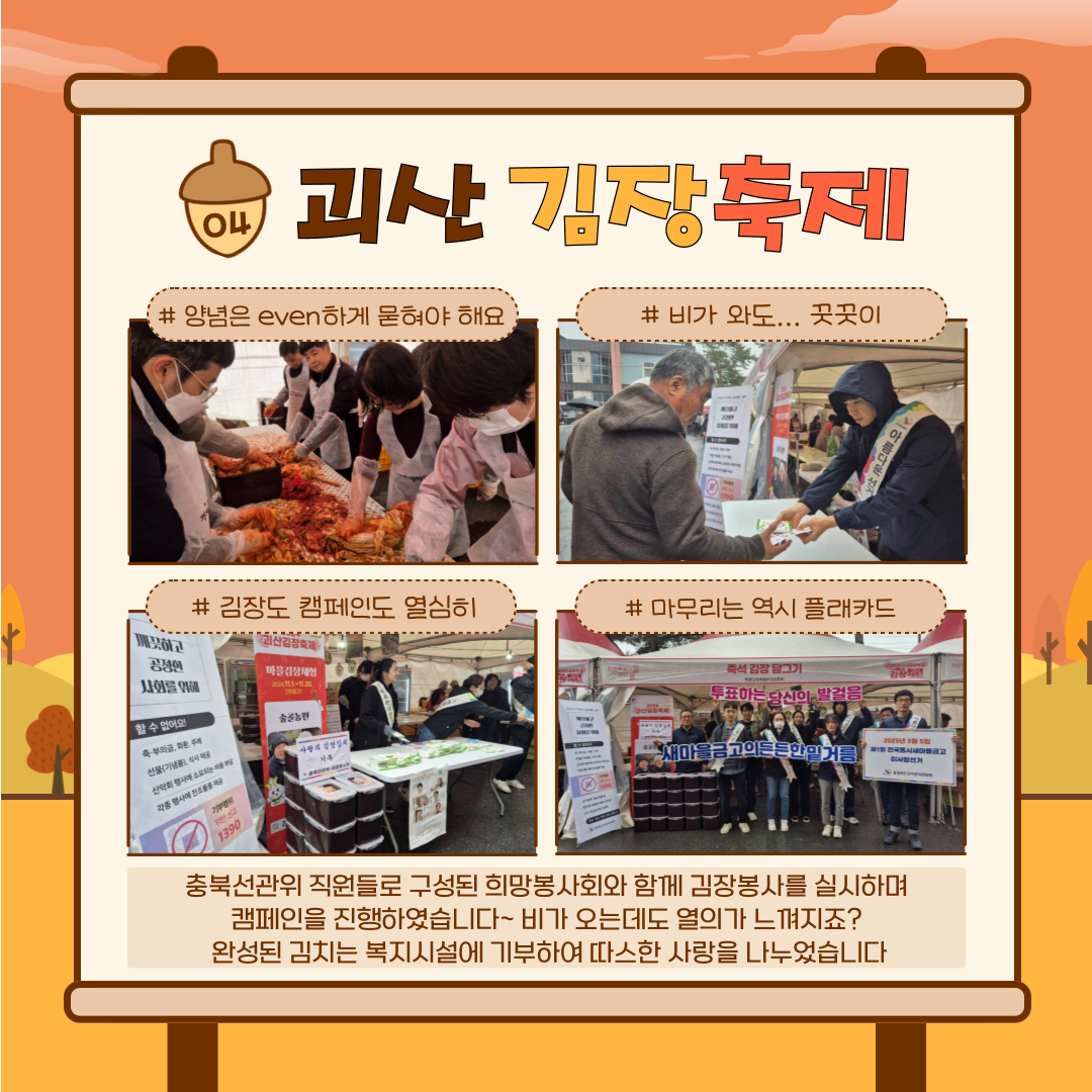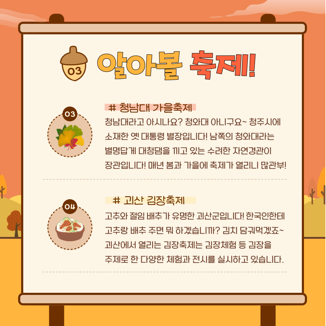 다시금 돌아왔습니다. 저번주에는 청남대 가을축제와 괴산 김장축제를 다녀왔는데