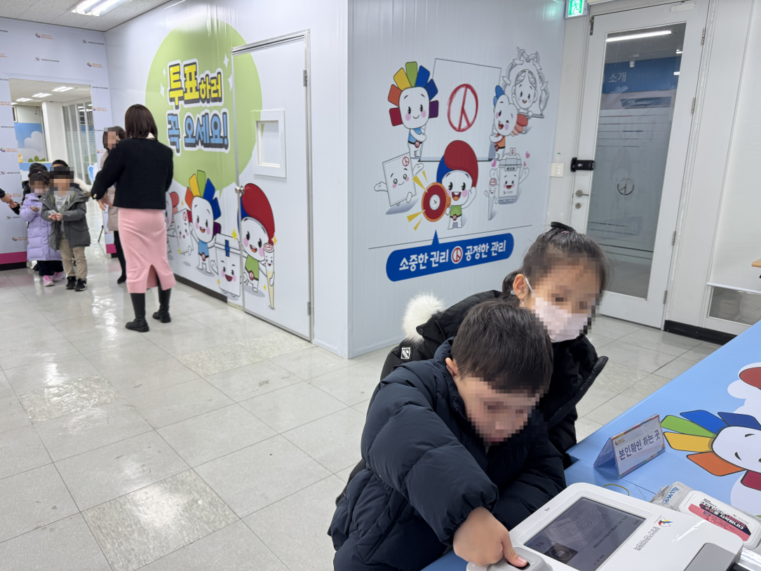 * 사진설명: 선거체험관 체험존에서 원아 한명이 본인확인기에 지문을 등록하고 있다.