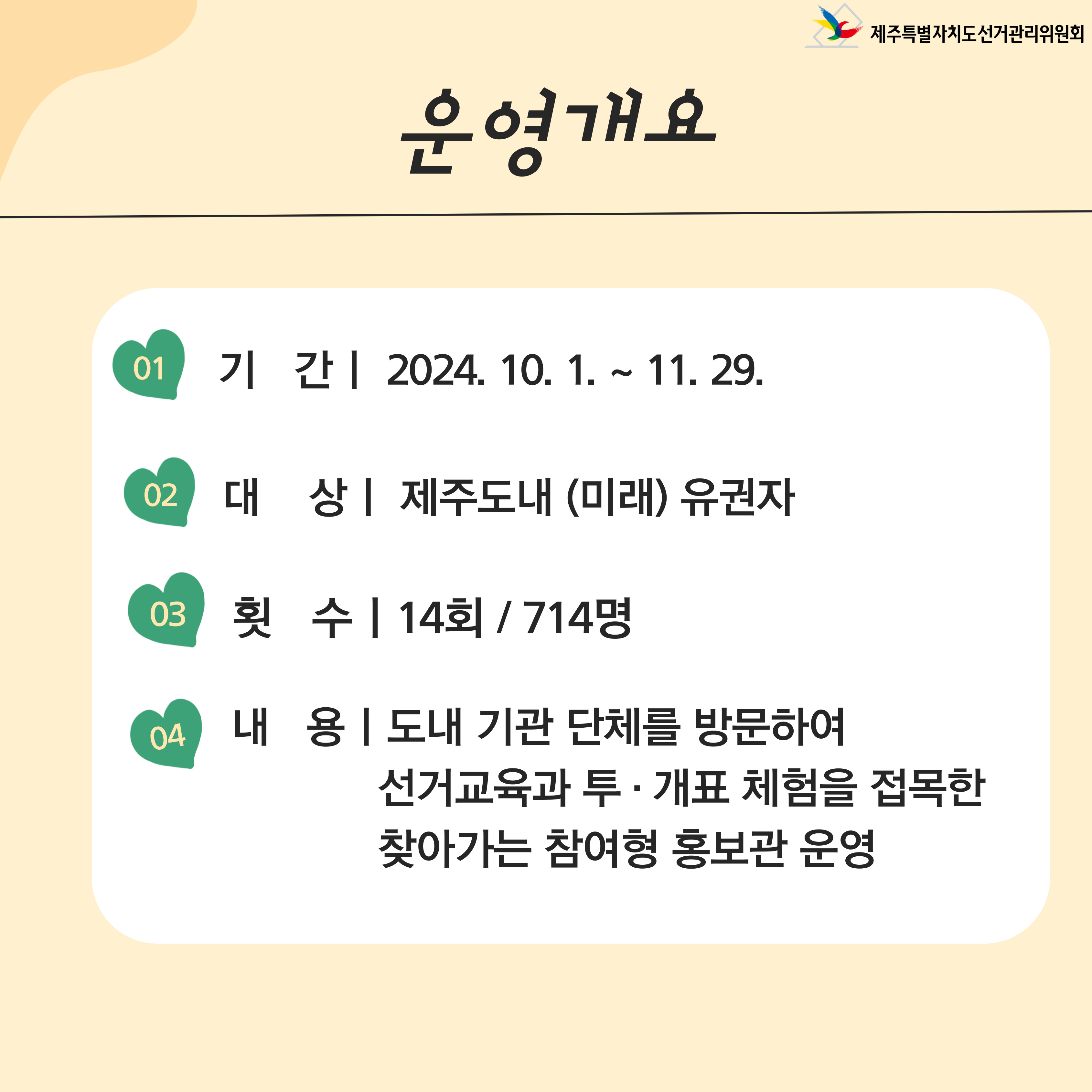 4. 내용: 도내 기관 및 단체를 직접 방문하여 선거교육과 투·개표 체험을 접목한 찾아가는 참여형 선거홍보관 운영