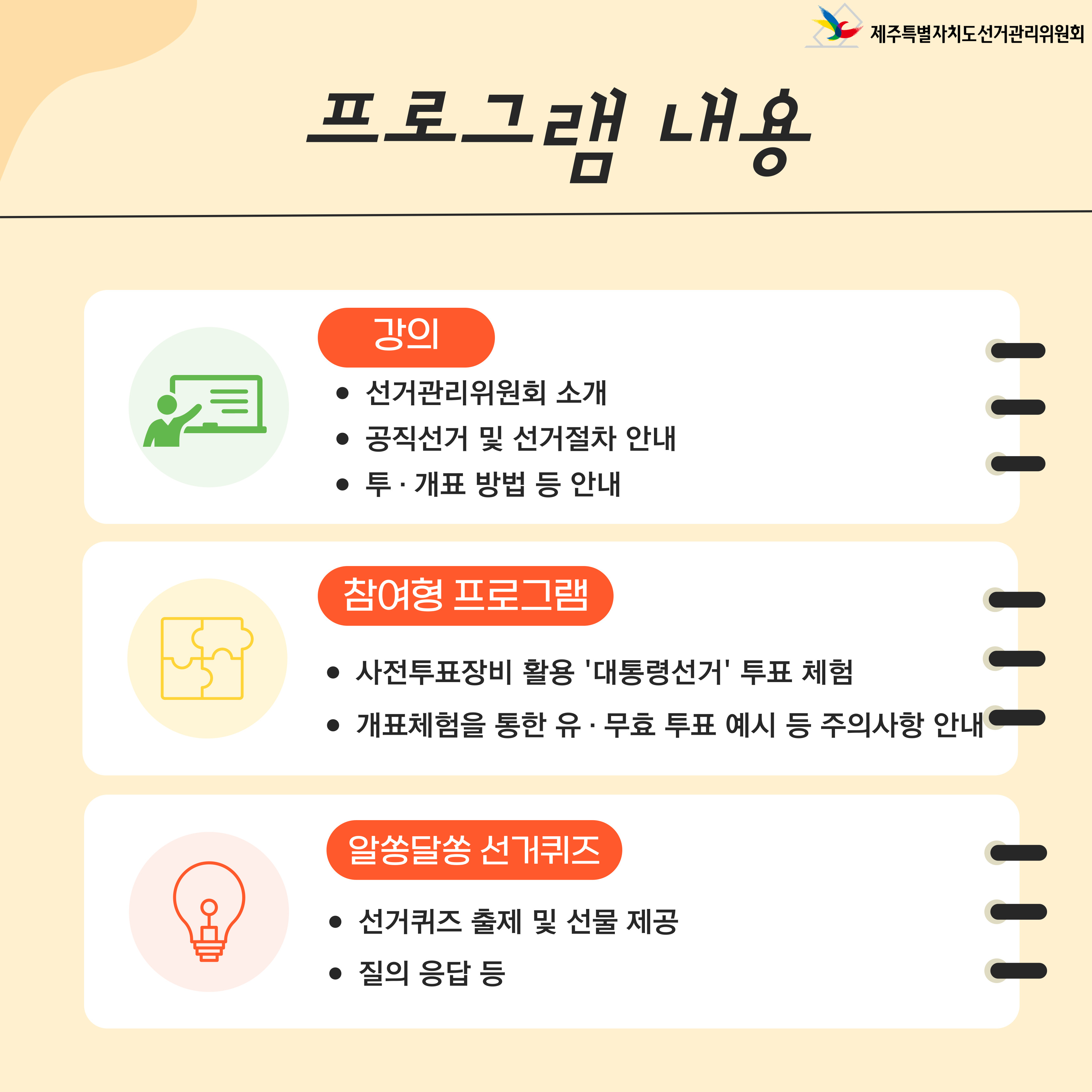 프로그램은 선관위 직원이 직접 선관위 소개, 공직선거절차 안내, 투·개표 방법 등을 안내하고
