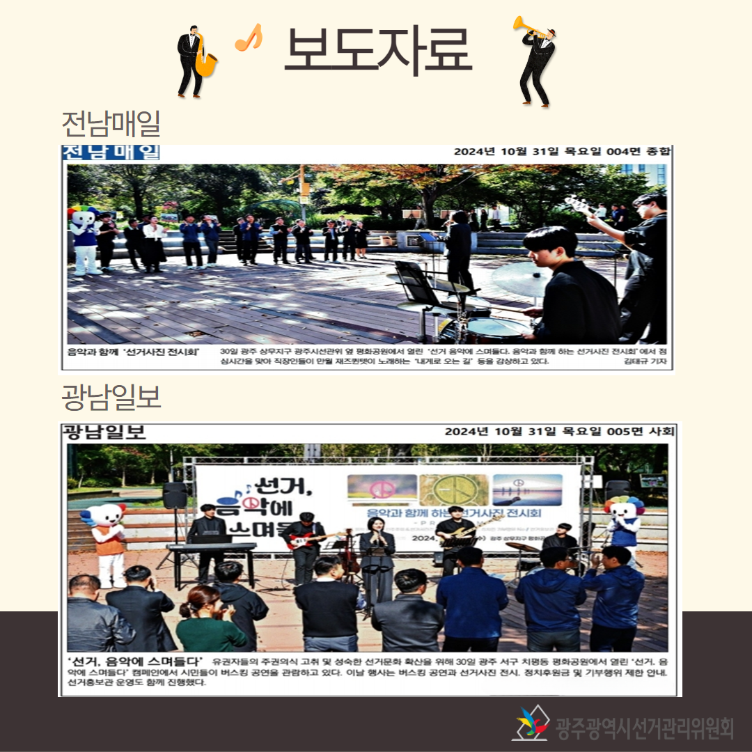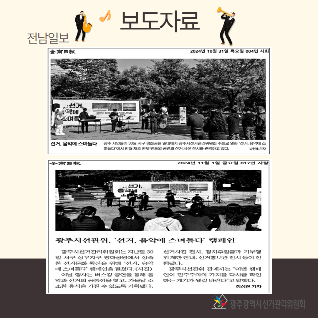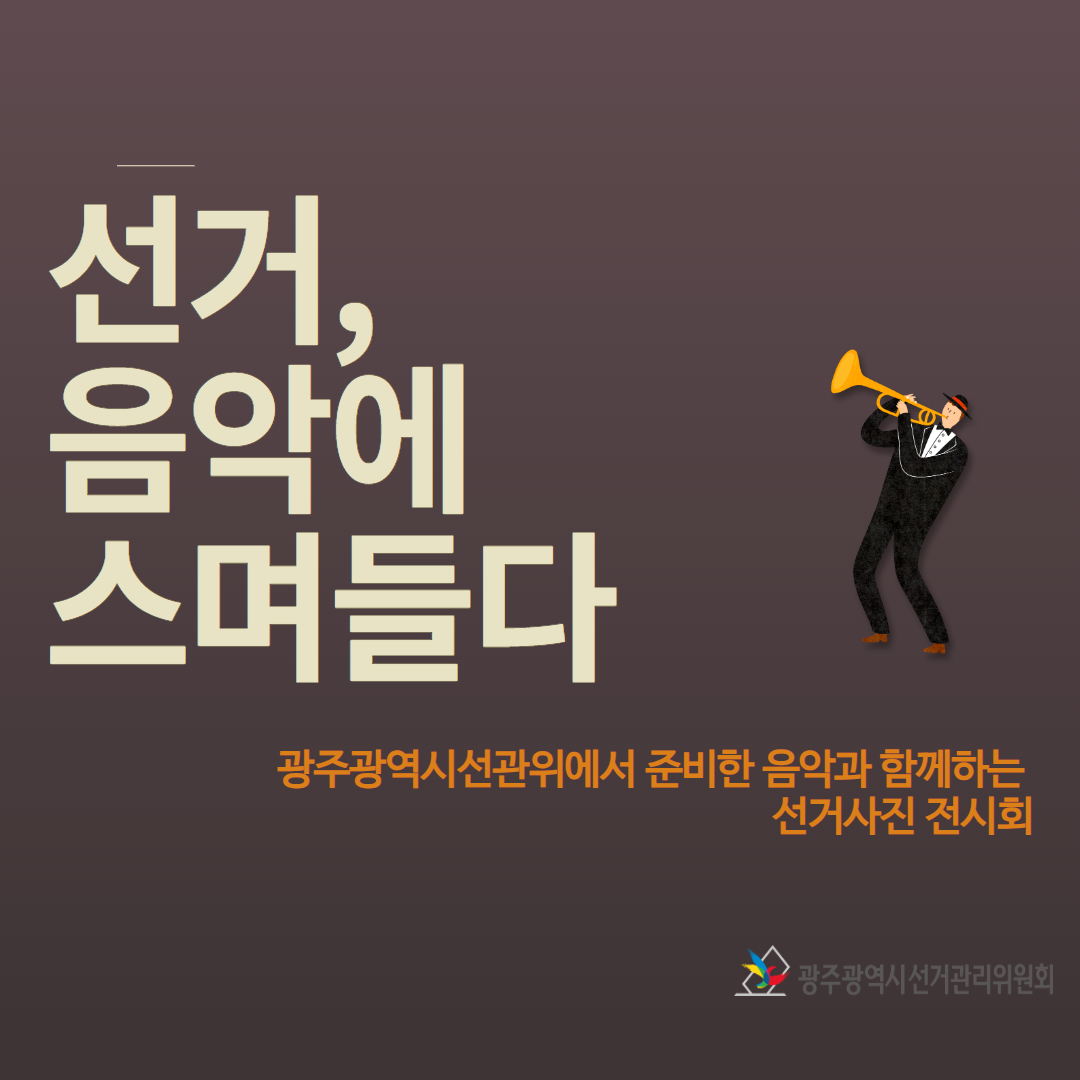 광주광역시선거관리위원회(062-382-7607)에서 제작한 '선거, 음악에 스며들다' 홍보 캠페인 개최 저작물은 "공공누리" 출처표시-상업적 이용금지-변경금지 조건에 따라 이용할 수 있습니다. 자세한 내용은 [저작권정책]을 확인하십시오.