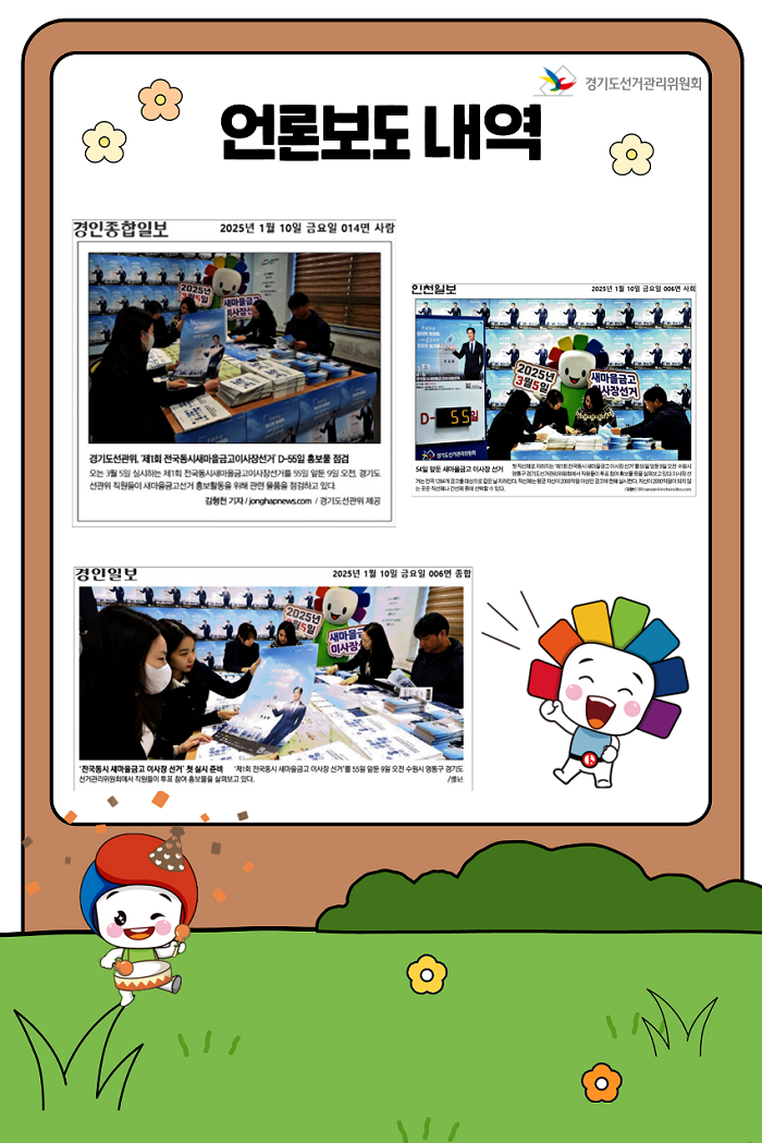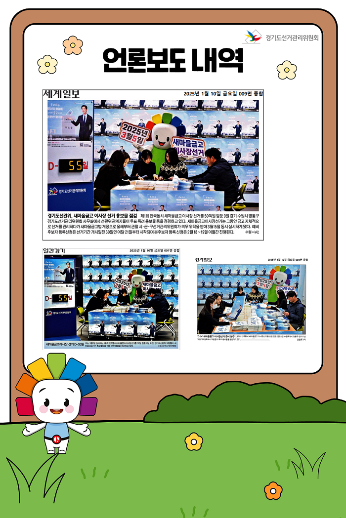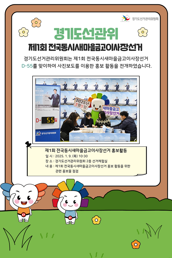 경기도선거관리위원회는 제1회 전국동시새마을금고이사장선거 D-55을 맞이하여 사진보도를 이용한 홍보 활동을 전개 하였습니다.