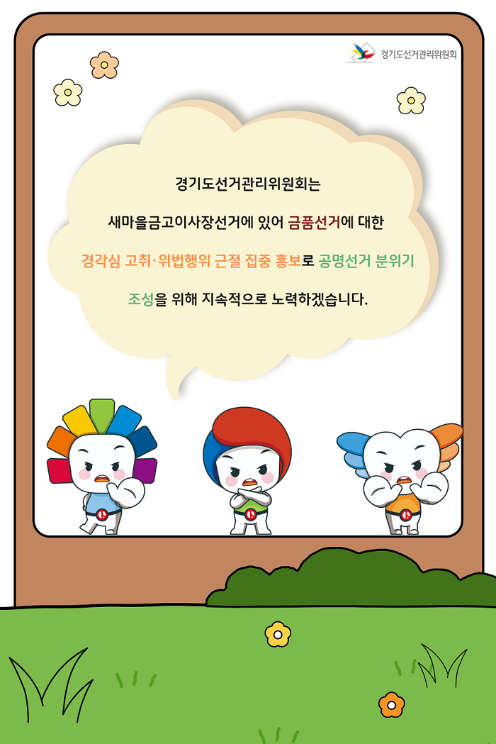 경기도선거관리위원회는 새마을금고이사장선거에 있어 금품선거에 대한 경각심 고취, 위법행위 근절 집중 홍보고 공명선거 분위기 조성을 위해 지속적으로 노력학겠습니다.
